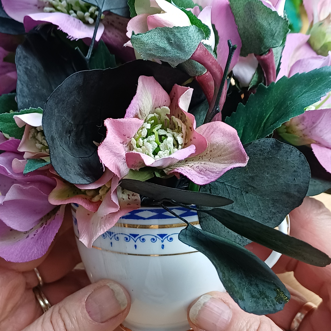 Deep pink and soft mauve petals are the feature of this beautiful hellebore vintage tea cup arrangement. Exquisite silk hellebore blooms blend beautifully with lush preserved eucalyptus populus. The deep colour of the eucalyptus really makes the flower colours pop. And the tea cup is a sweet, delicate Royal Albert Crown China vintage cup with a modern geometric design and gold trim.